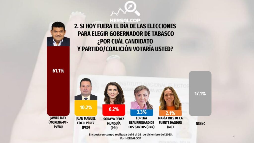 Javier May como candidato de la coalición MORENA-PT-PVEM con 61.1% sería Gobernador de Tabasco si hoy fueran las elecciones. Con 10.2%, el segundo lugar sería el Senador Juan Manuel Fócil del PRD.