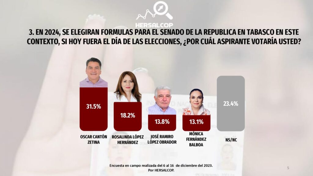 Para el Senado de la República, Oscar Cantón tendría 31.5% seguido por Rosalinda López con 18.2, José Ramiro López Obrador con 13.8% y Mónica Fernández Balboa con 13.1%, habiendo un 23.4% de indecisos.