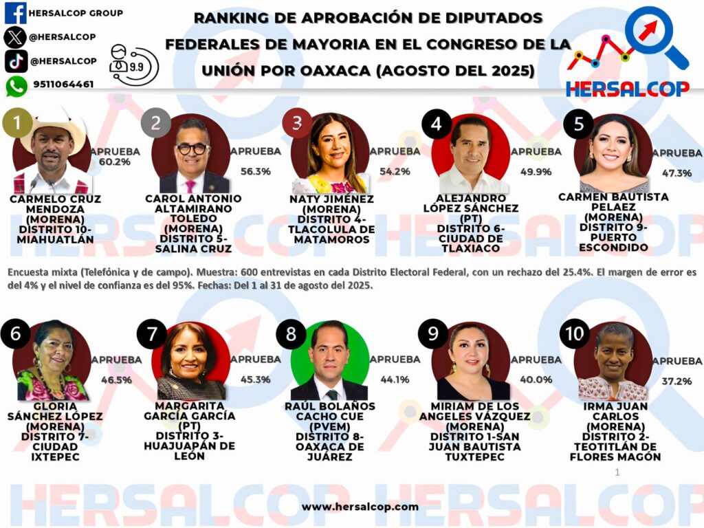 En el más reciente Ranking de Aprobación de Diputados Federales de la Unión por Oaxaca (agosto 2025), elaborado por Hersalcop, el legislador Carol Antonio Altamirano, representante del Distrito 5 con cabecera en Salina Cruz, se ubica en la segunda posición con un 56.3% de aprobación ciudadana. El también Presidente de la Comisión de Hacienda en la Cámara de Diputados ha sabido compaginar su capacidad técnica en la conducción de temas financieros con un reconocimiento social que lo posiciona entre los representantes más valorados de Oaxaca. Durante el mes de agosto, Altamirano Toledo destacó por su participación en diversos temas de interés público, entre los que sobresalen: Presentación del punto de acuerdo para declarar Zona de Desastre a las comunidades de la Costa y el Istmo de Tehuantepec afectadas por los recientes fenómenos naturales, con el objetivo de agilizar apoyos federales. Rueda de prensa en Huatulco, donde dio a conocer su agenda de trabajo enfocada en la reactivación económica y turística de la Costa. Reuniones de trabajo con autoridades municipales y productores de la región del Istmo, a quienes respaldó con gestiones en materia de infraestructura, comercio y programas sociales. Su labor constante en la Comisión de Hacienda, consolidando propuestas que buscan fortalecer las finanzas públicas con un enfoque social. La combinación de resultados técnicos y respaldo ciudadano coloca a Carol Antonio Altamirano como uno de los perfiles con mayor proyección en el ámbito legislativo de Oaxaca.