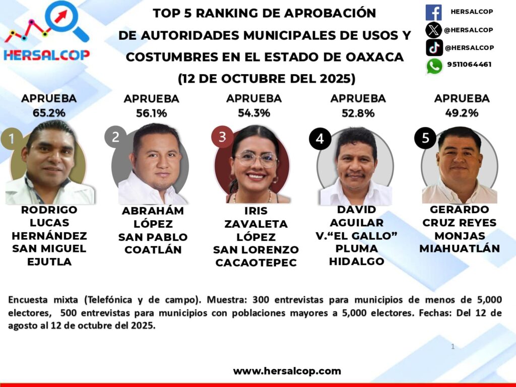 La encuesta, realizada por Hersalcop, consultora especializada en opinión pública y análisis político, evaluó la gestión de las autoridades locales en municipios regidos por sistemas normativos internos. La medición combinó entrevistas telefónicas y de campo en todo el estado.