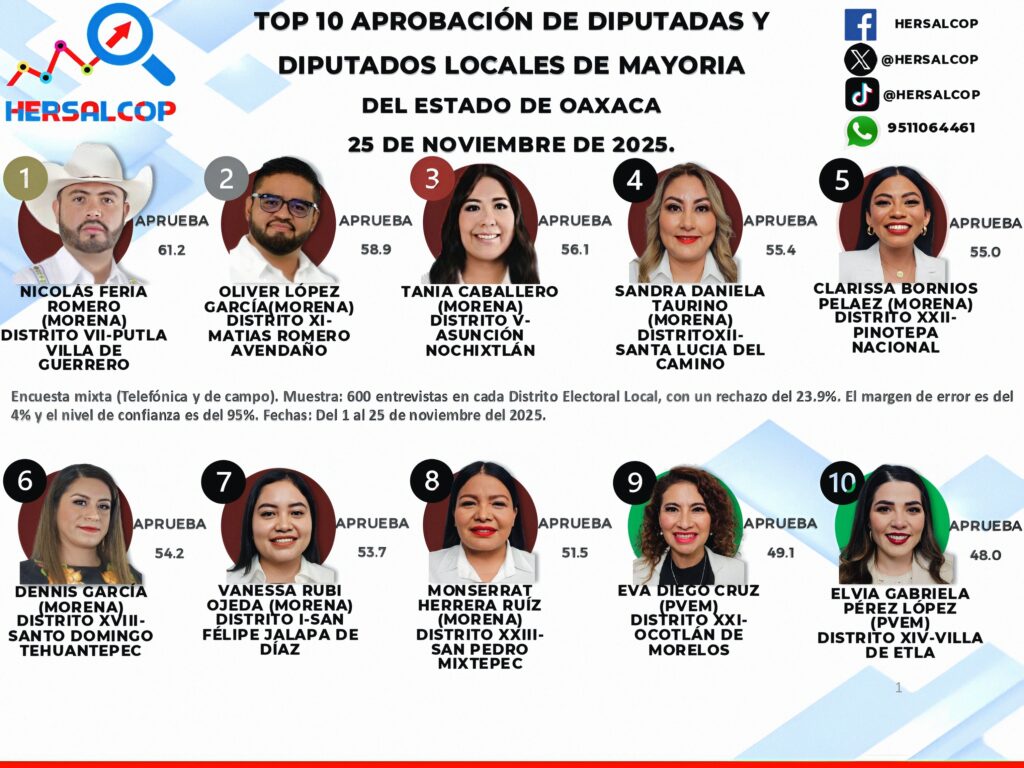 Oaxaca de Juárez, Oaxaca a 25 de noviembre del 2025 — En Oaxaca se consolida un hecho político trascendental: ocho de los diez mejores diputados y diputadas locales de mayoría relativa son mujeres. En el ranking de Hersalcop, se evidencia el peso real del liderazgo femenino en la vida pública del estado, así como su capacidad de articulación territorial, su cercanía con la gente y su creciente influencia legislativa. Tres nombres destacan por su fuerza política, su trabajo visible y su aprobación ciudadana: Tania Caballero, Sandra Daniela Taurino y Clarissa Bornios.